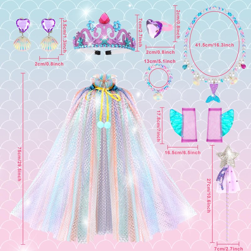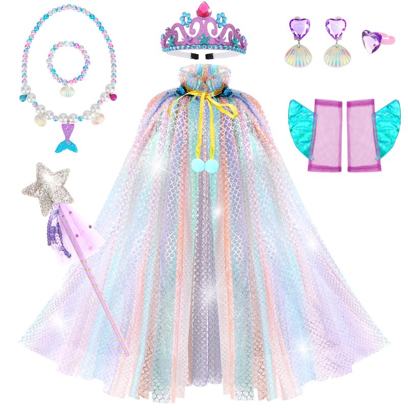 - Princess Mermaid Costume set for Girls: Dress up as a pretty little mermaid with our mermaid princess dress up set. It comes with colorful mermaid princess cape, mermaid glove, princess crown tiara and matching princess accessories. A must have princess dress up accessories set for little girl to complete their getup.