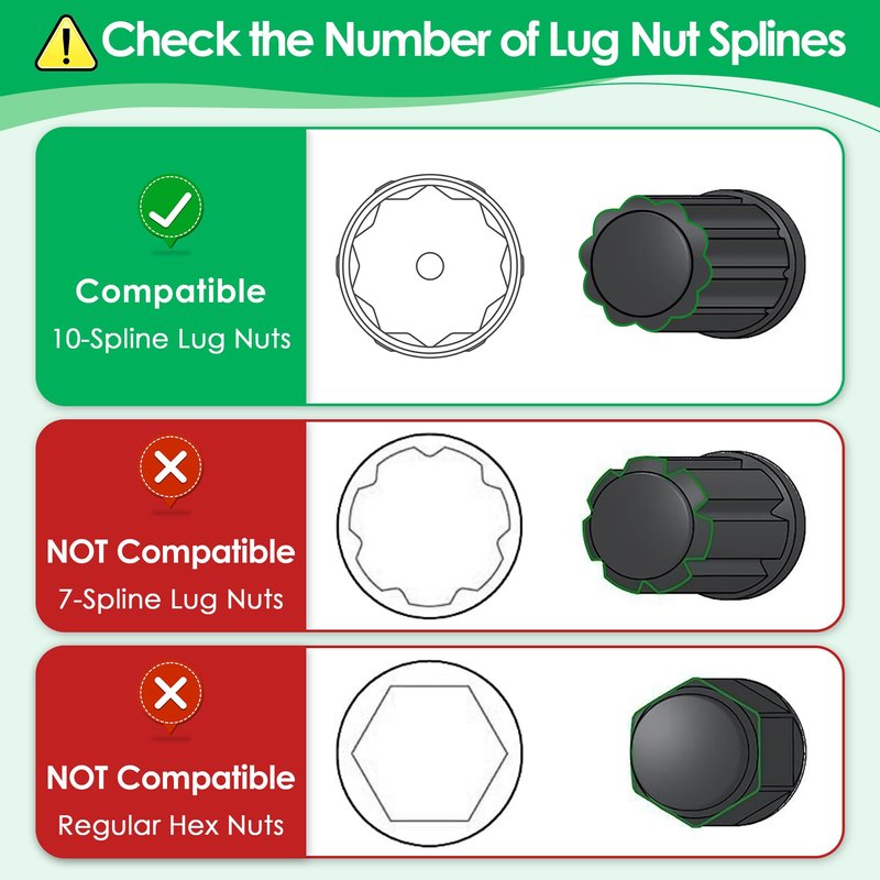 - Attention: before using the wheel lug nut socket, make sure the socket spline matches the spline of the lug bolt and nut, otherwise the lug nut socket will break; This 10 spline lug nut key is suitable for use with hand wrenches only, not for use with impact tools