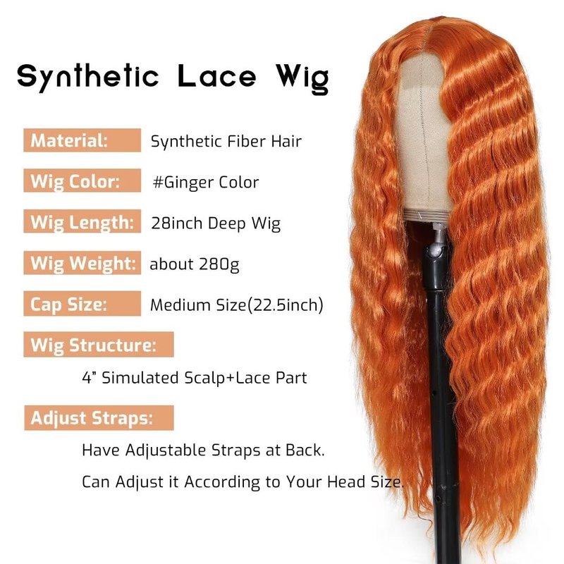 - Deep Wave Synthetic Lace Wig: Length 28”(71cm). Ginger Color You Can Wear This Synthetic Lace Front Wig To Halloween,Cosplay Costume ,Party And Any Occasions, As Well As For Daily Use. Synthetic Curly Hair Wigs is Also A Good Gift For The Fashion Lady.