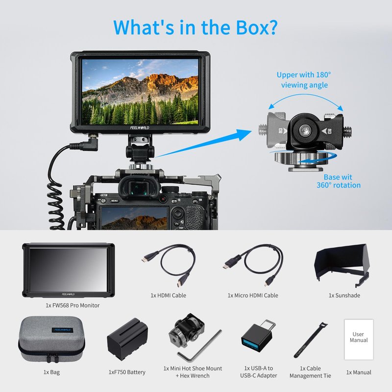 - 【Package Include】1x FEELWORLD FW568 Pro Camera Video Monitor, 1x F750 battery, 1x Carry Case, 1× HDMI Cable, 1× Micro HDMI Cable, 1× Sunshade, 1× Mini Hot Shoe Mount+Hex Wrench, 1× USB-A to USB-C Adapter, 1× Cable Management Tie, 1× Manual