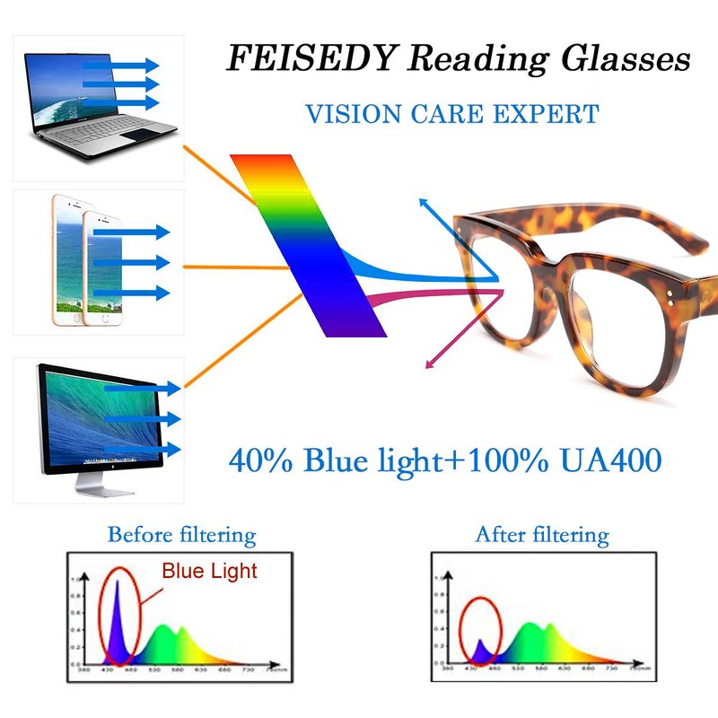 - FEISEDY Reading Glasses - Classic Brand Design Square Thick Frames make you more stylish. Nice quality frame, Accurate presbyopia degree, Block blue light Lenses, Protect eye health light, perfect for eye protection while reading, sticking to eye health. Great choice for better life.