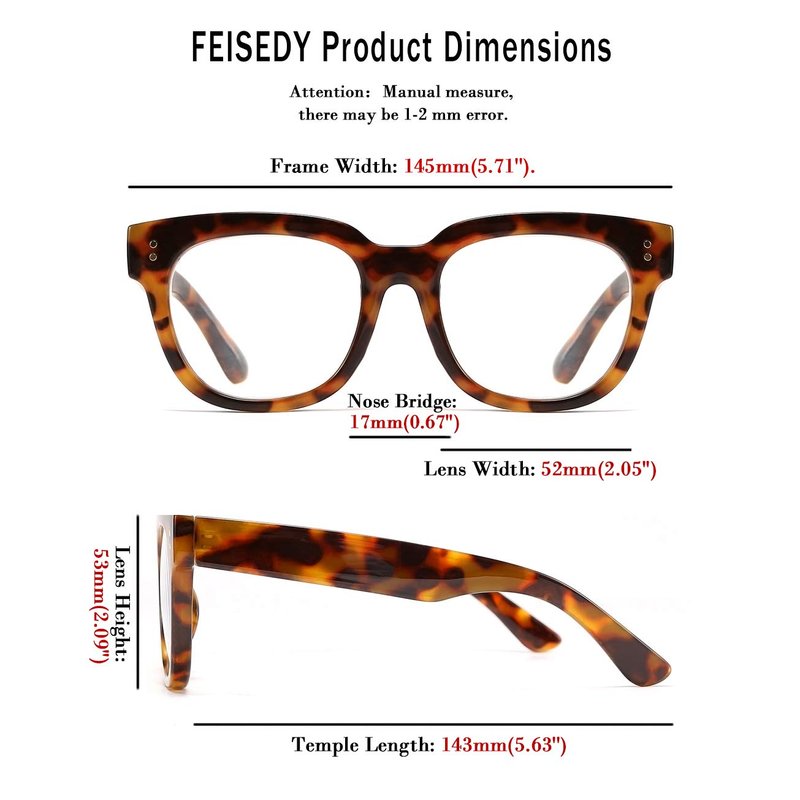 - FEISEDY Product Dimensions -- Lens Width: 52mm(2.05''), Lens Height: 53mm(2.09''), Temple Length: 143mm(5.63''), Nose Bridge: 17mm(0.68''), Frame Width: 145mm(5.71''). Attention:Manual measure, there may be 1-2mm error. Attention: Please confirm the size before purchase