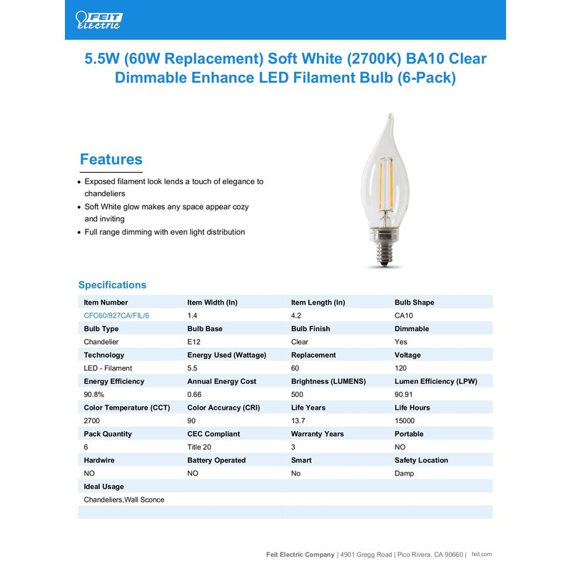 Feit Electric 60-Watt Equivalent CA10 LED Light Bulb, Dimmable Enhance Glass Candelabra Filament, 500 Lumens, 13 Yrs. Lifetime, 2700K Soft White, 6-Pack - CFC60/927CA/FIL/6