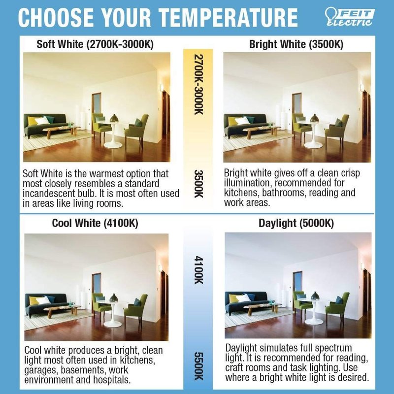 - Soft white - this light temperature is the warmest option that most closely resembles a standard incandescent bulb. It is often used in areas like living rooms and bedrooms. The light has a Color temperature of 2700K, giving it a slightly yellow tint. This light is perfect for any are you want to feel cozy and inviting