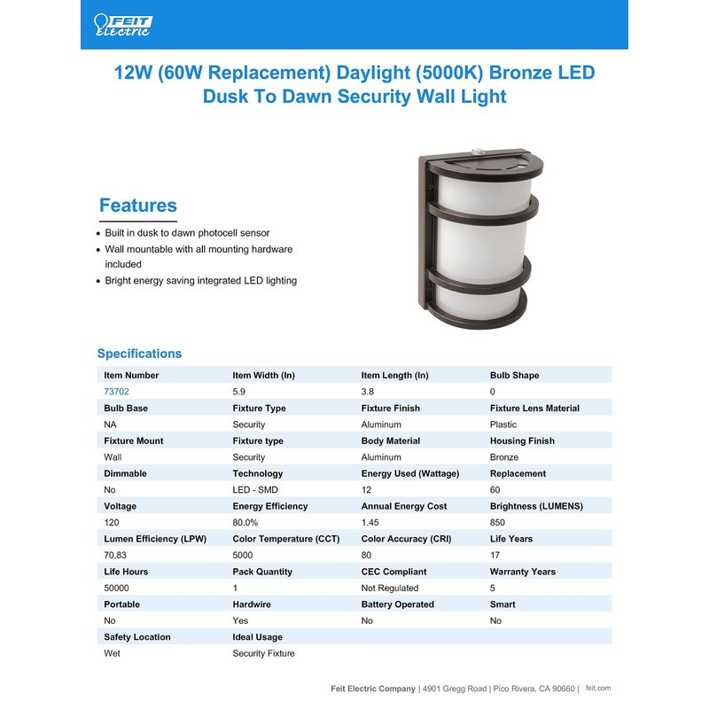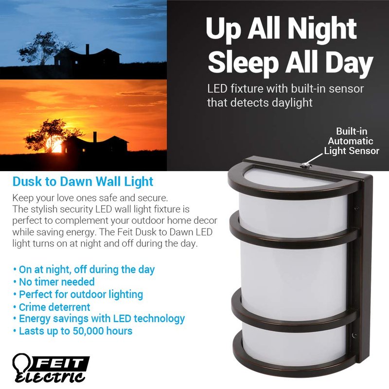 - HOME BEAUTIFUL AND SECURE - Feit Electric’s outdoor security LED lighting keeps your family and home secure while saving energy. Complement any home décor with stylish outdoor lighting fixtures. Attractive, functional lighting for any porch, patio