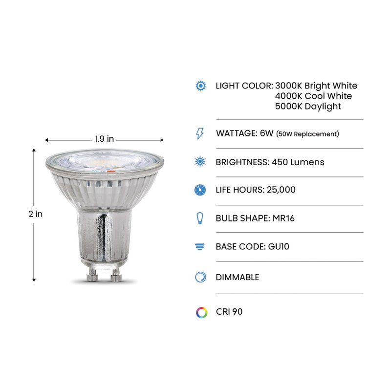 - ADJUSTABLE WHITE LIGHT – Customize your lighting with Feit Electric's MR16 LED bulb, featuring adjustable white light options including Bright White, Cool White, or Daylight. Adjust the color temperature directly on the bulb during installation to perfectly match your existing lighting or create the ideal mood for any space. Perfect for use in track lighting, accent lighting, displays, and landscaping.