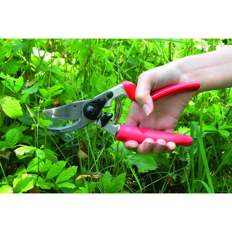 - The one-hand pruning shear has an ergonomic design through a hand and wrist protection and an optimisation of the force by a revolving handle. Furthermore it is equipped with a non-slip coating.