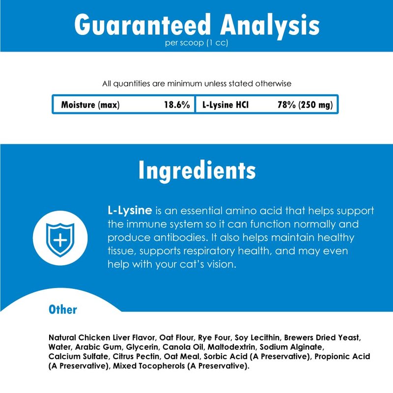 - L-Lysine HCL Immune System Support for Cats helps keep your cat healthy by supporting the immune system naturally so that it can function normally and produce antibodies