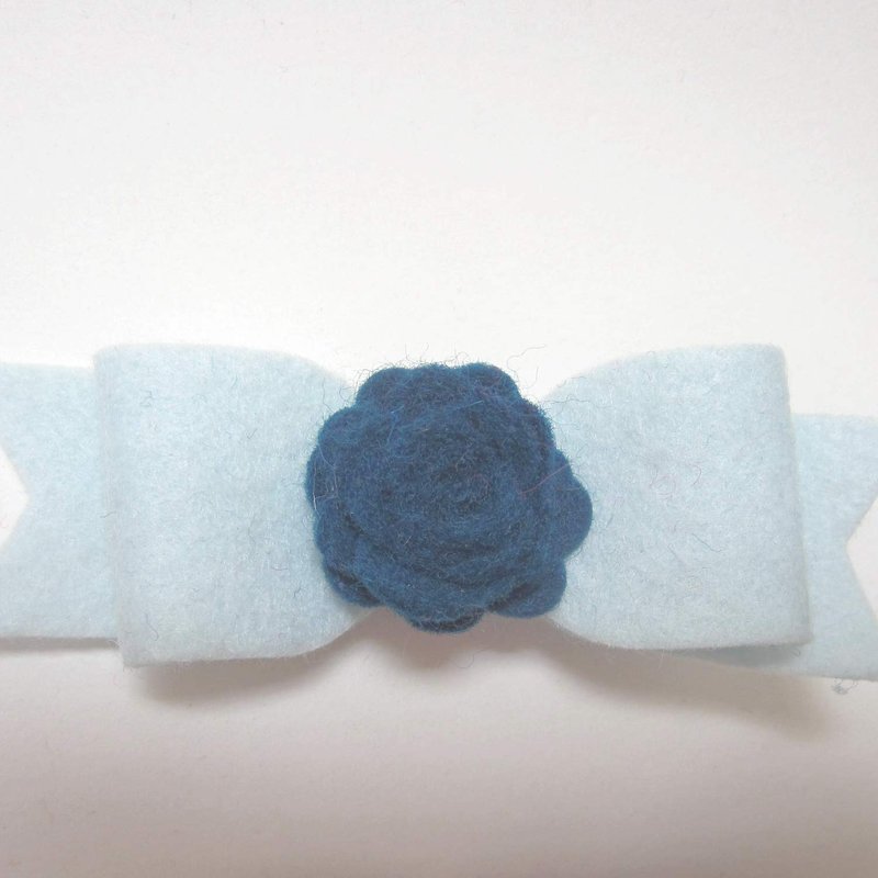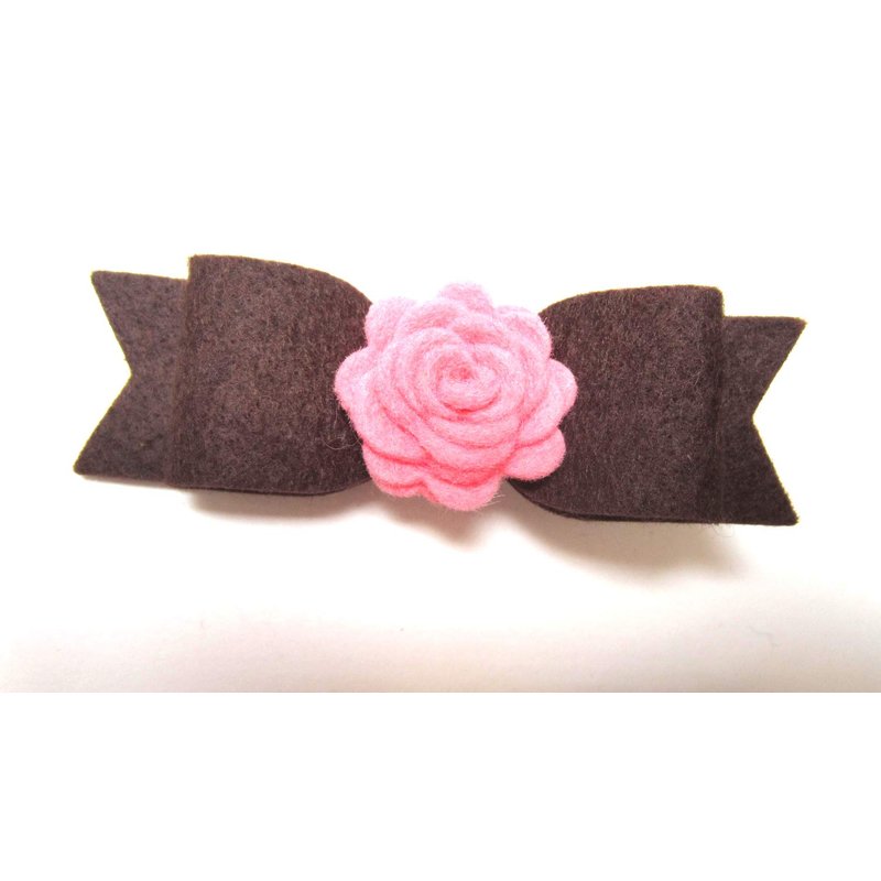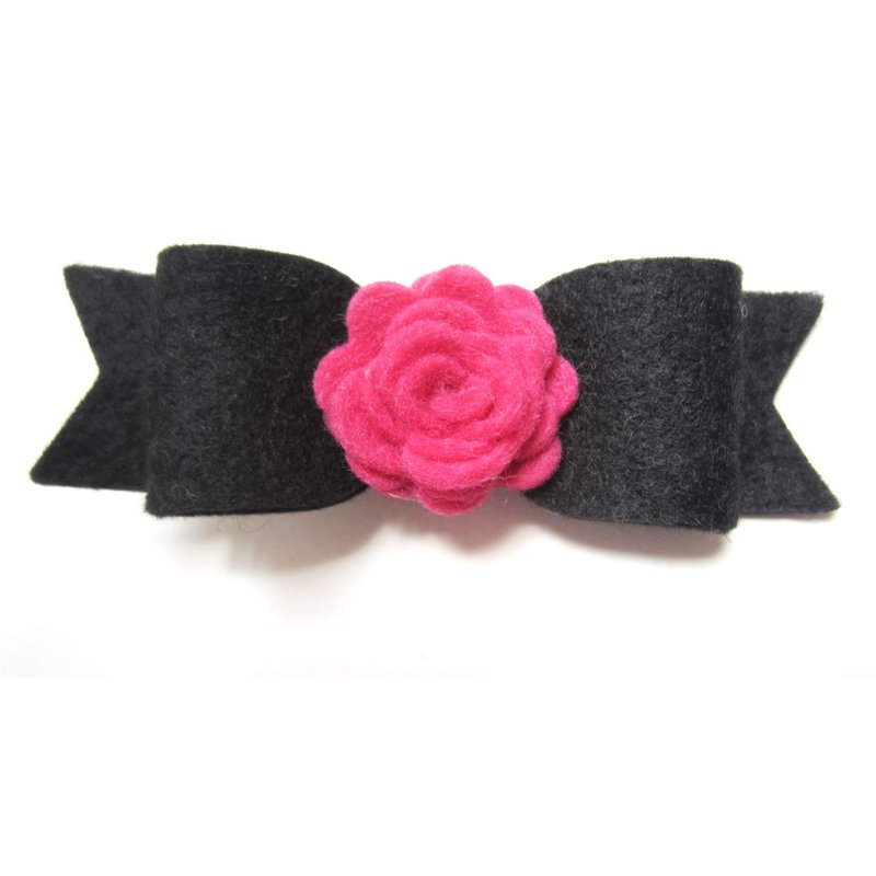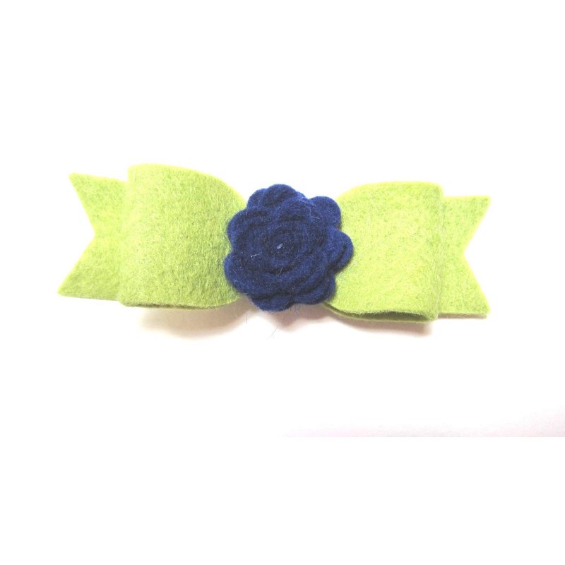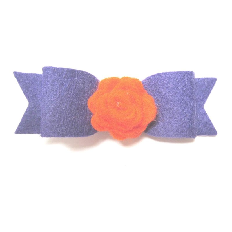 A felt bow with felt rose hair clip. The bow measures approximately 3 1/4" long and is on a partially lined alligator clip. The clip is lined in a ribbon that coordinated with the bow or the rose. Color choices are in photo #2. Hydrangea w/purple roseLight blue w/dark blue rosePurple w/orange roseVineyard w/burgundy rosePea Soup w/dark blue rose Brown w/pink rose Black w/hot pink rose Marble w/yellow rose *Every attempt is made to accurately display the colors of the felt however, the settings on computer screens can cause the colors to vary.**