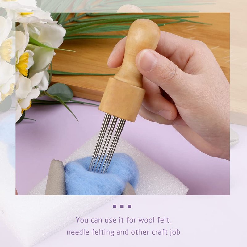 - Needle Felting Starter Kit: 1 pcs wood handle tool with 8 needles on it,1 pair Finger Guards(Random Color).