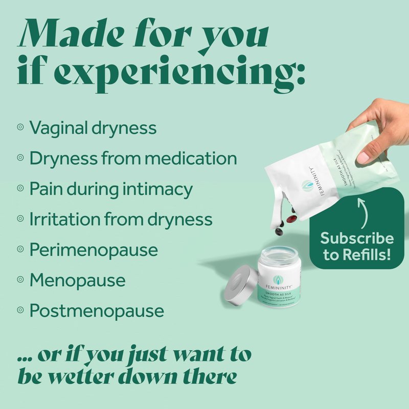 - MADE FOR YOU – Smooth as Silk is made for those experiencing general dryness, dryness from medication, pain from dryness during intimacy, itching or irritation from dryness, perimenopause, menopause, or postmenopause... or if you just want to be wetter down there.