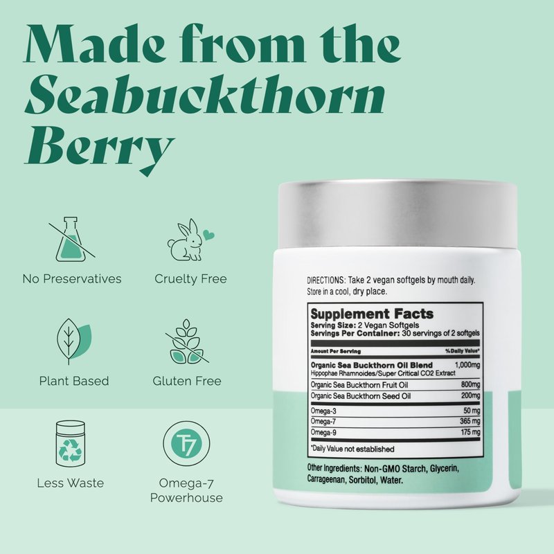 True beauty begins on the inside. With the power of our exclusive T7 Premium Himalayan Sea Buckthorn berries (aka “seaberry”) this product helps hydrate mucous membranes from the inside out. We've created a soft-gel dietary supplement to nourish and protect the body and promote healthy skin, hair, and nails. Sea buckthorn also benefits the digestive tract, urogenital tract, and cardiovascular system. Our T7 Turkestanica sea buckthorn is an Omega 7 fatty acid powerhouse, unrivaled in its nutrient profile. Packed with over 190 bioactive compounds, it thrives in the extreme alpine environment of the Himalayan mountains to provide you with unmatched health and beauty benefits. It's made from a proprietary blend of sea buckthorn fruit and seed oil which is USDA organic, PETA certified cruelty-free and vegan, and free of preservatives, GMOs, gluten, sodium, and yeast.