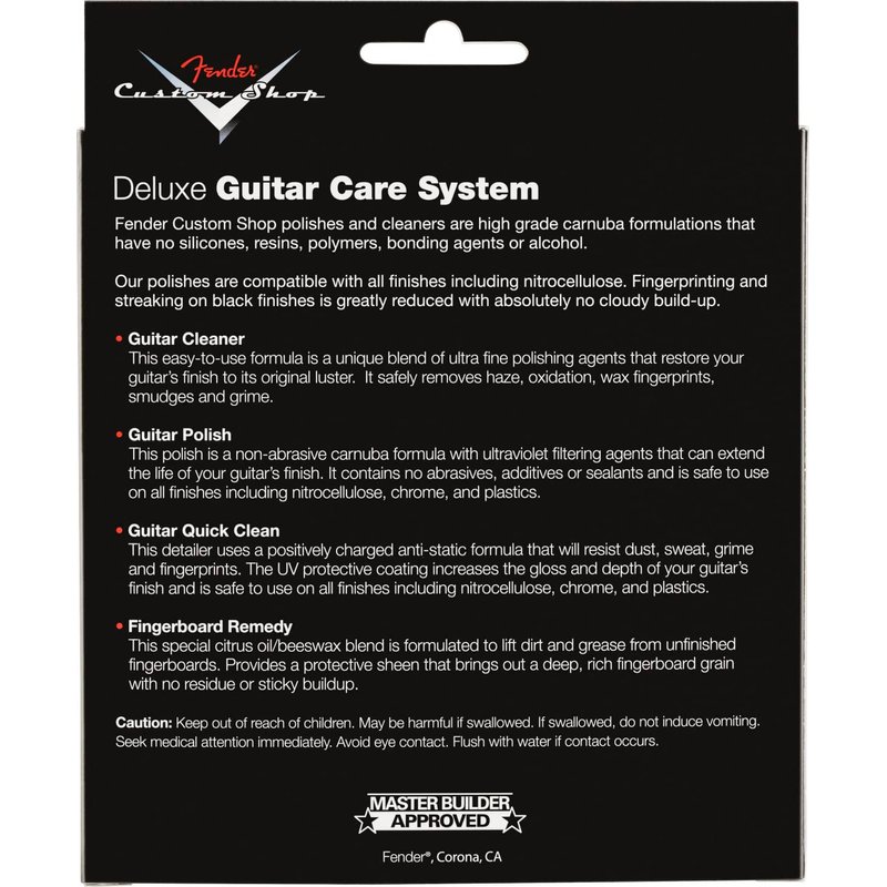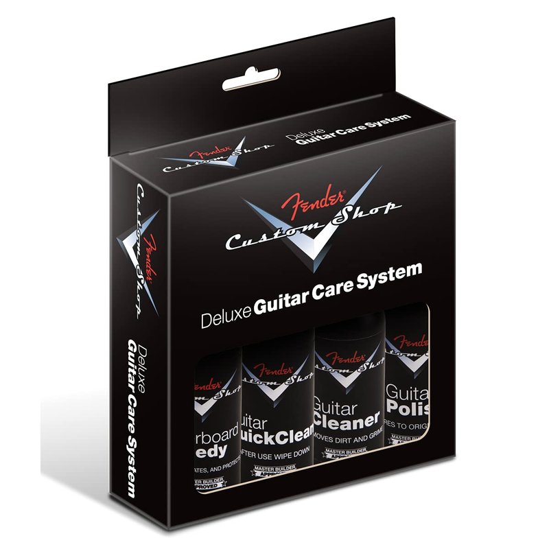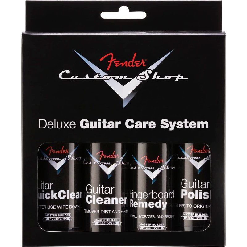 - Four-step kit contains one bottle of each Fender Custom Shop Guitar Care product: Cleaner, Polish, Quick Clean and Fingerboard Remedy
