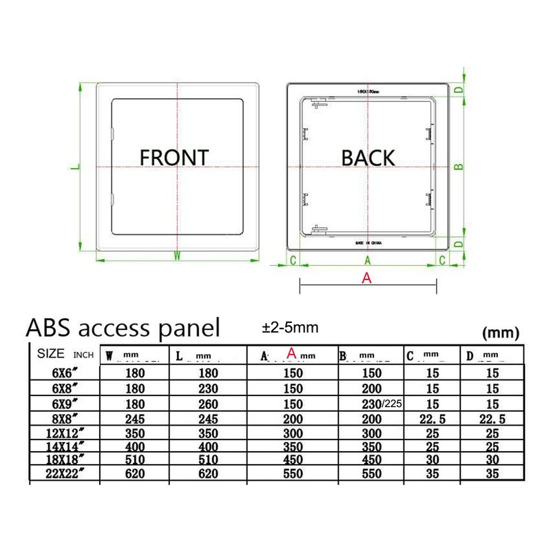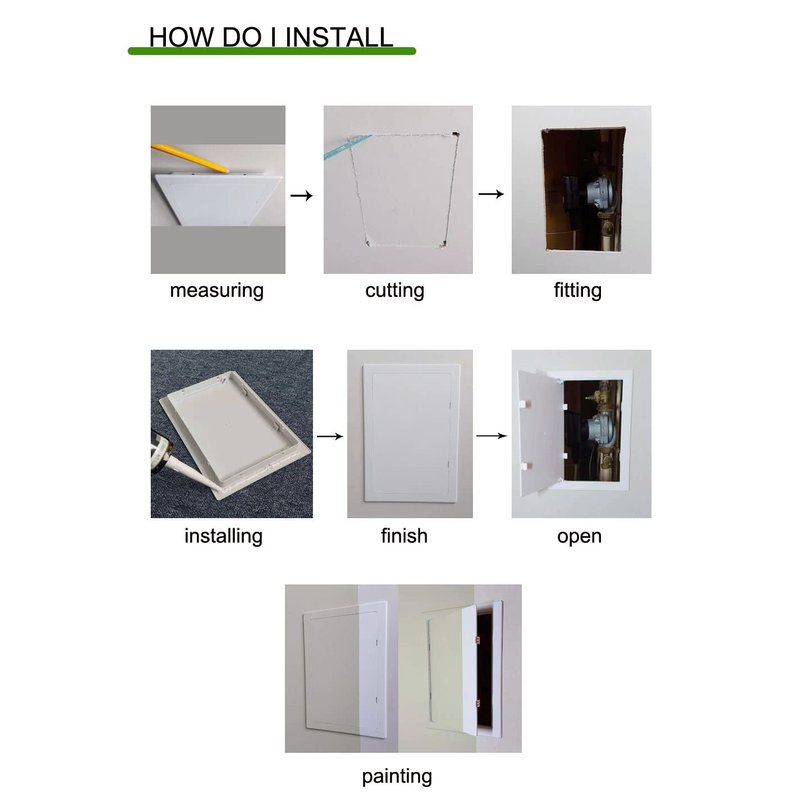 Typically, access panels are installed during the initial construction of a home or commercial building. But often, due to plumbing, electrical or HVAC renovations, new access doors must be installed to provide electricians, plumbers or HVAC technicians with convenient access to concealed systems. They are easy to install by simply applying a caulking adhesive to the back of the frame and pressing it into place. The high impact plastic with UV stabilizers will not fade or corrode. The hinged door is completely removable from the frame.( Note: Only the access panel, Not included adhesive. ) How to Install? 1. Measuring – Use a template to help installers measure the hole.( access panel come without template ) 2. Cutting – To cut drywall, you will need a jab saw. To cut around your outline, you can push the jab saw through the existing drywall or create starter holes with a drill. 3. Sanding – Once, you’ve cut the holes, it’s important to sand the edges. This will ensure your frame fits securely in the hole. 4. Anchoring the Frame – Use adhesive ( adhesive prepare by yourself ) for tight frame to complete installation.