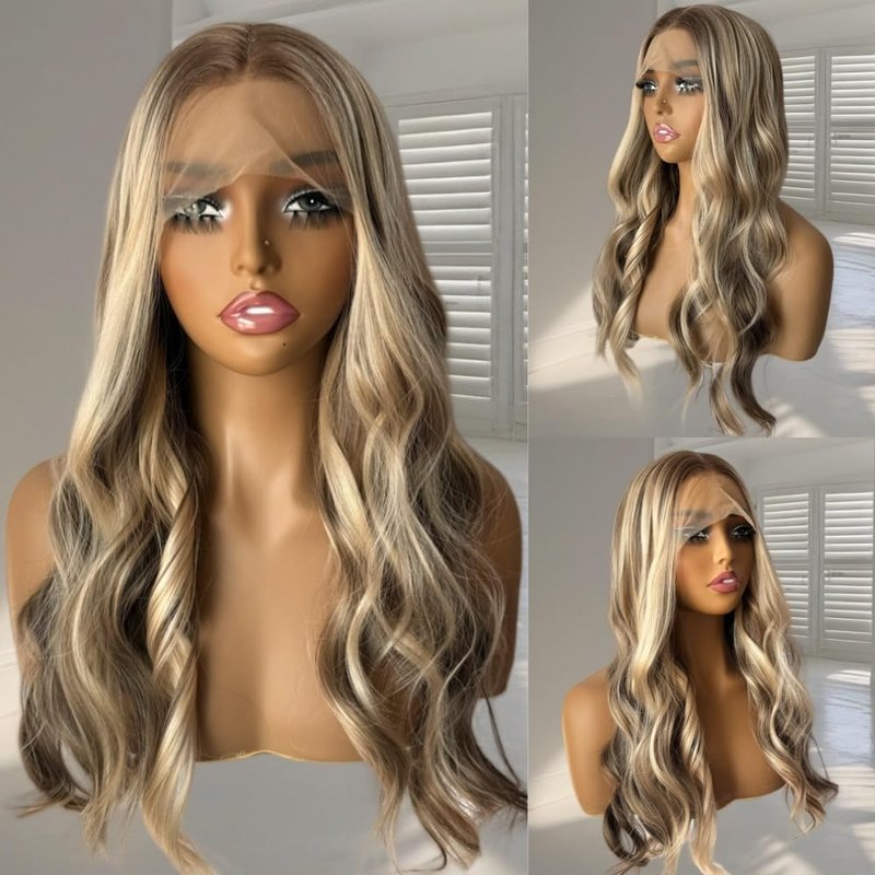 FENJUN HAIR Highlight Ash Blonde Lace Front Wigs Body Wave Lace Frontal Synthetic Wig Mixed Brown and Blonde Color Glueless Long Wavy Synthetic Lace Wig for Women