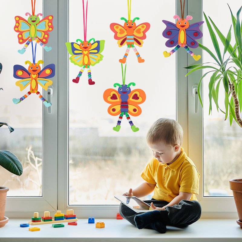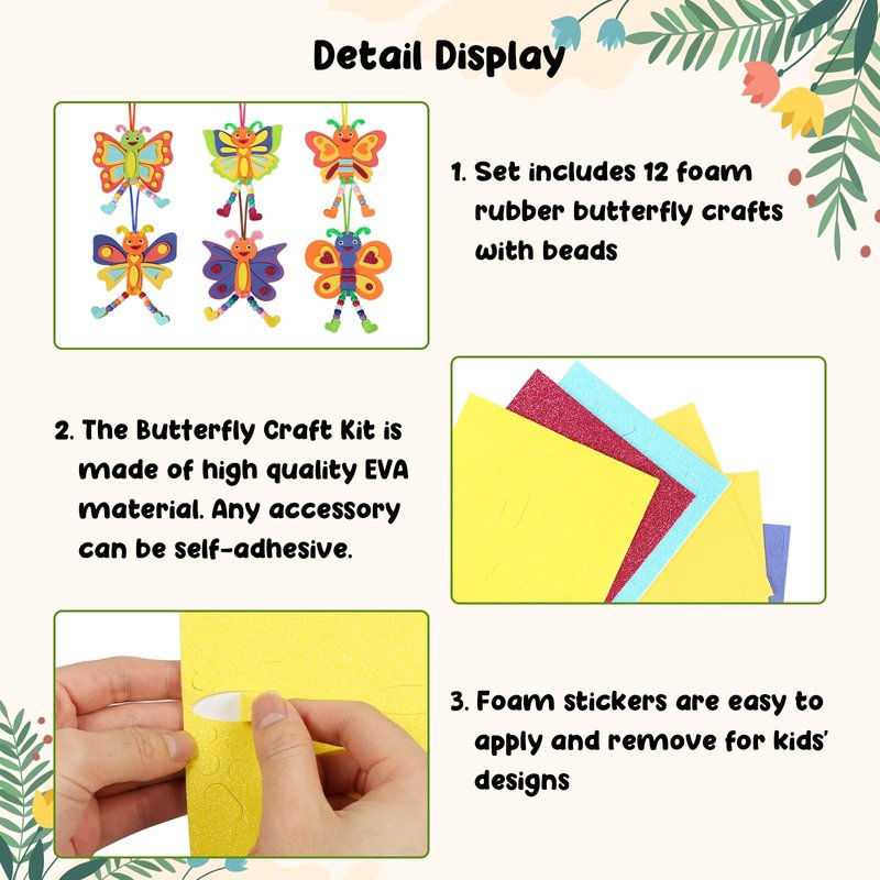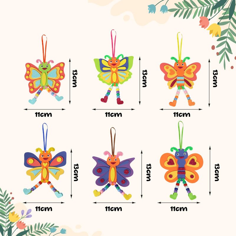 - Butterfly Craft Kit for Kids:The Butterfly EVA foam art crafts for kids includes 12 pack of butterfly craft sets.There are 6 different designs,butterfly stencil, butterfly body, heart, other foam sticker accessories ,wiggly eyes and beads .A lot of foam stickers and beads enough quantity to meet needs on a activity for kids,kids can make their own butterfly arts crafts set!
