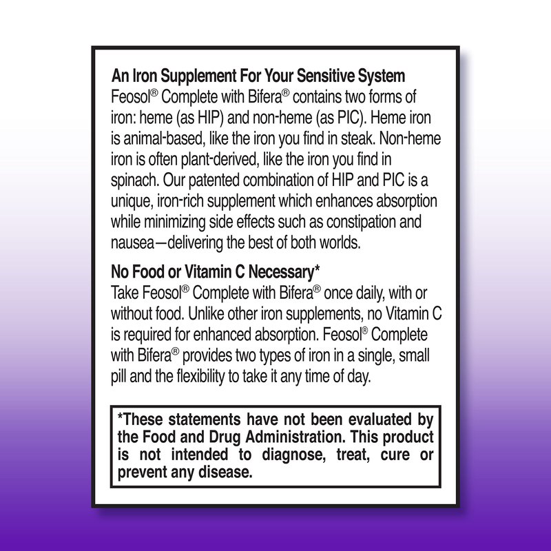 Feosol Complete Iron Supplement Caplets, Bifera Iron for High Absorption, Heme and Non-Heme Dual Action Minimizes Side Effects, 1 Per Day, For Energy and Immune System Support, Made in USA, 30 count