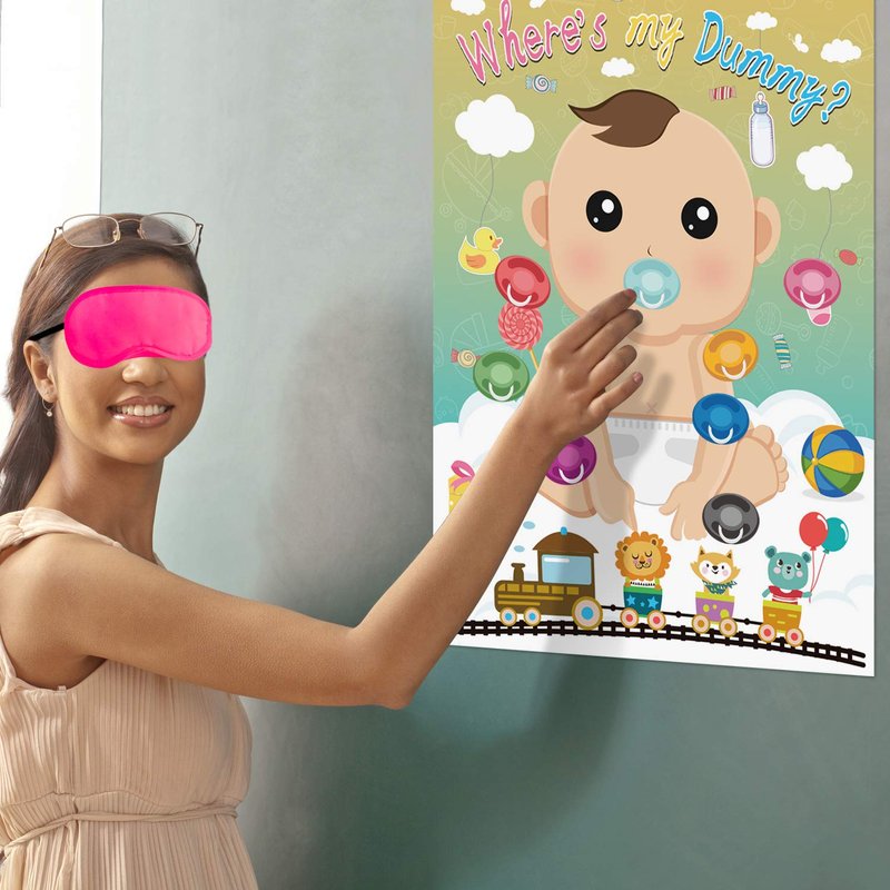 - How to play: Paste the poster on the wall with self-adhesive dot sticker, then wear the eye mask, take a pacifier sticker and pin it on the poster, who's more closer who wins