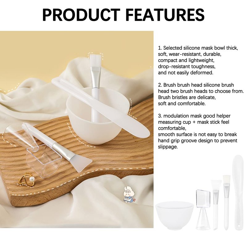 5Pcs Diy Face Mixing Bowl Facial Mud Bowl Silicone Facemask Bowl Cosmetic Beauty Tool, Microwavable Silicone - Professional Spa Facial Mask Mixing Bowl for Home Salon Spa Face Skin Applicator Bowl (White) Features 1. Made of silicone, soft and flexible. 2. This silicone bowl is resistant to high temperature, drop and not easily deformed. 3. Suitable for personal home use or professional beauty salon use. 4.Microwavable and dishwasher safe, Heat resistant up to 446°F/230°C Specification Color: White. Material: Silicone. Size: about 3.93*2.67 inches Package Including 1 x medium bowl 1 x stirring stick 1 x applicator stick 1 xmeasuring spoon 1 x brush respectively In addition to mixing masks, it can also be used as a bowl for ingredients such as spices. Reasonable size, can hold a small amount of ingredients, such as salt, spices, honey, baking soda.
