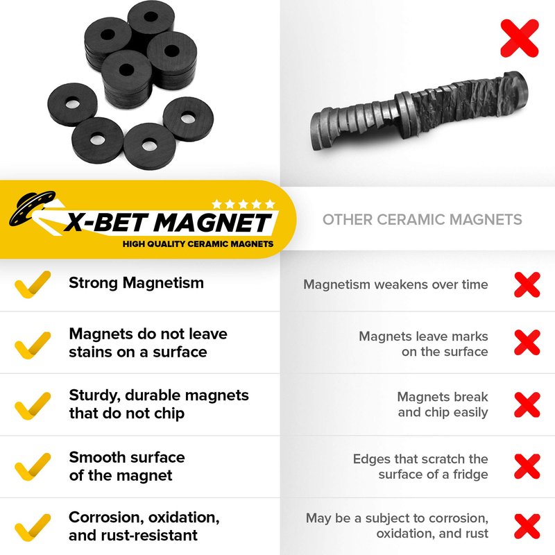CONGRATULATIONS! YOUR SEARCH FOR THE PERFECT FERRITE MAGNETS WITH HOLES IS OFFICIALLY OVER!There is no need to worry about magnets’ power, resistance and reliability anymore. We invest tremendous amount of time and effort researching, developing, and controlling the quality of our industrial ring magnets.What Makes X-bet Round Flat Magnets with Holes The Best Ever:Practical size - OD: 31mm, ID: 9.5mm, Thickness: 4.75mm ready to be used circle magnets for all your needs.Best price/quality ferrite dot magnets - in comparison to more expensive rare earth or neodymium magnets. 18 pcs high quality flat donut magnets satisfies the requirements of ISO 9001.Force – Grade 8, 4200 Gauss. Our round hole ceramic magnets are the strongest ceramic circular magnets for crafts and diy you can buy. X-bet strong flat dot magnets don’t lose their power.High Resistance to Thermal Stress to Corrosion & Oxidation.X-bet ring circular magnets can be glued on to any surface. These are receptive to most adhesives including hot glue, E6000, Goop, Bond 527, Liquid Nails, 2 part epoxies and more.Where To Use:Flat Circle Hole Magnets Great for all Home, Office, Craft, Hobby, Science Projects and Product Manufacturing applications. Perfect for glass gems, mirrors, for making refrigerator magnets, bottle cap magnets, small signs, magnetic buttons, and much more. Also Our Craft Magnets are used as kitchen magnets, office magnets, science magnets, classroom magnets, fridge magnets, refrigerator magnets, diy magnets and hobby magnets.By Buying our Ceramic Disk Donut Magnets you can be sure in 100% result!>==> CLICK 'ADD TO CART' NOW Don’t waste time, order ✮✮✮✮✮ Round Ceramic Hole Magnets now before the deal expires