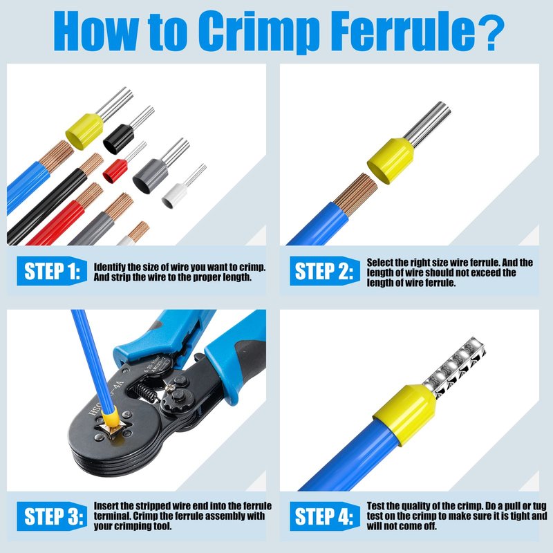 STEP 1: Identify the size of wire you want to crimp. And strip the wire to the proper length. STEP 2: Select the right size wire ferrule. The ferrule should be the same size as the wire. And the length of wire should not exceed the length of wire ferrule. STEP 3: Insert the stripped wire end into the ferrule terminal. Crimp the ferrule assembly with your crimping tool. STEP 4: Test the quality of the crimp. Do a pull or tug test on the crimp to make sure it is tight and will not come off.