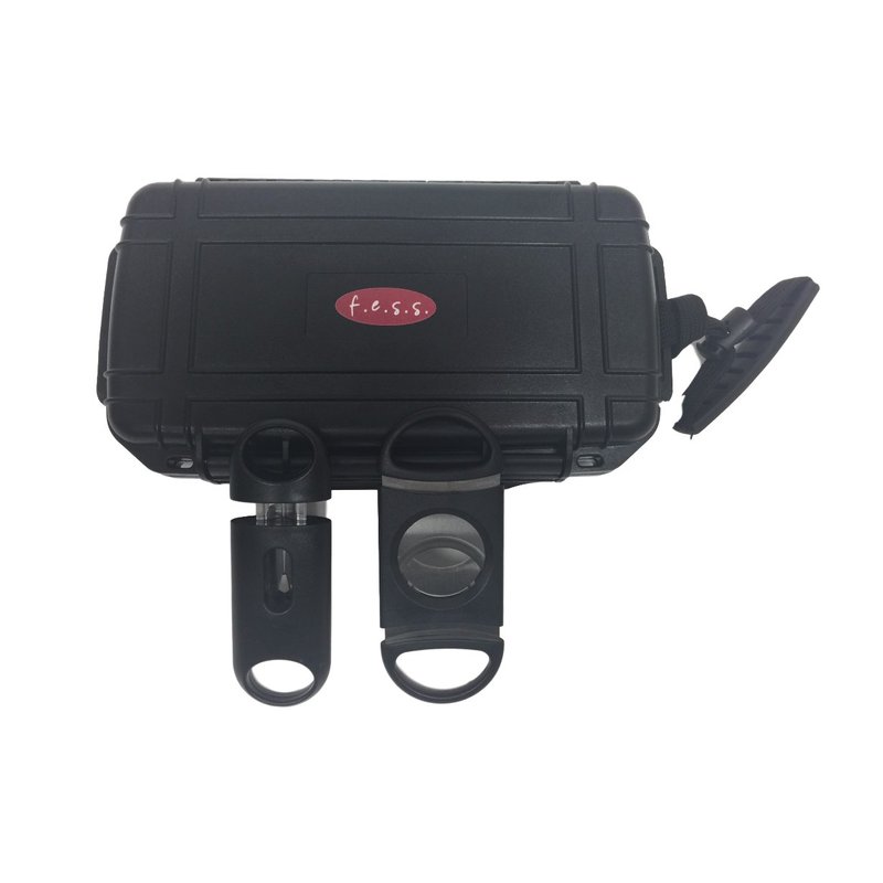 This rugged set from F.e.s.s. fess has all of the right cutter you need to enjoy your favorite cigars while traveling. The strong case will hold up to five cigars and keep them well protected. It includes a small humidifier to ensure your cigars will be in the optimal condition once you reach your destination. This humidor also comes with a 80 ring gauge cigar cutter to cut your cigars and a V cut 62 ring gauge cigar cutter. . Set Includes: Fess Travel Humidor Holds up to 5 Cigars Built in Humidifier Impact Resistant Case with Foam Liner Waterproof Locking Clasps and 80 gauge guillotine and 62R v cut cigar cutter. F5 travel humidor will fit perfectly into a golf bag, Briefcase, Glove Compartment, or tackle box. Holding up to 5 Cigars, this airtight, watertight, and crush proof humidor is an excellent case.