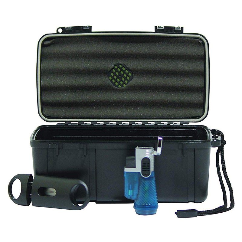This rugged set from F.e.s.s. fess has all of the right Case with Accessories you need to enjoy your favorite cigars while traveling. The strong case will hold up to five cigars and keep them well protected. It includes a small humidifier to ensure your cigars will be in the optimal condition once you reach your destination. This humidor also comes 3T Torch and a V cut 52 ring gauge cigar cutter. . Set Includes: Fess Travel Humidor Holds up to 15 Cigars Built in Humidifier Impact Resistant Case with Foam Liner Waterproof Dual Locking Clasp Trident gift set travel humidor will fit perfectly into a golf bag, Briefcase, Glove Compartment, or tackle box. Holding up to 15 Cigars, this airtight, watertight, and crush proof humidor is an excellent case.