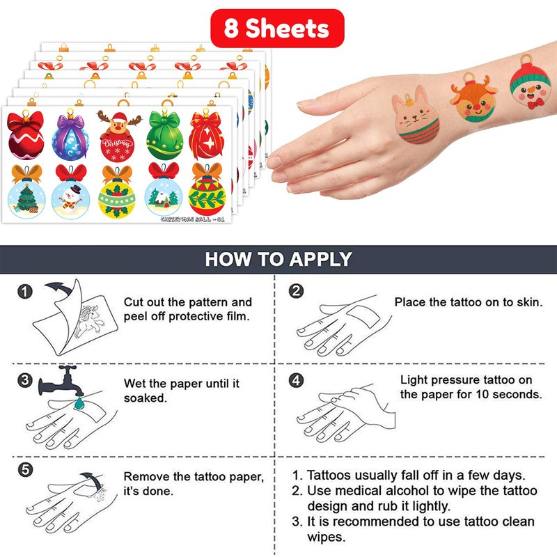 - 🎁【PERFECT TATTOOS FOR THEMED CHRISTMAS ORNAMENTS BALL】: Christmas Ornament Ball Temporary Tattoo decals are available in a set of 8 sheets. These sheets showcase a total of 80 intricate and captivating designs inspired by Christmas and holiday symbols, making this collection a must-have for enthusiasts of festive art. Measuring 6.1 * 3.1 inches each, these sheets are perfect for both children and adults.