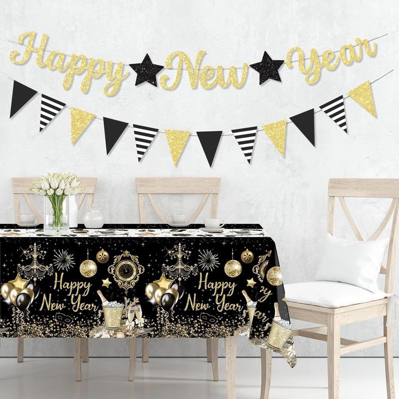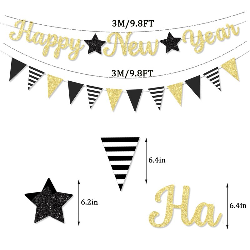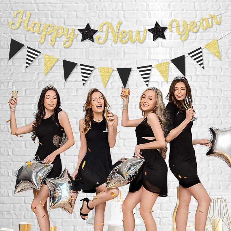- 1... GLITTER NEW YEAR BANNER WITH GARLAND: The Black and Gold new years eve 2025 banner with star happy new year Paper Triangular Bunting garland is a perfect new year decorations. This large 9.8 feet new year banner will add a luxurious touch to your party, very suitable for 2025 New Year eve party. Adding a lot of fun to the New Year 2025 banner Home Holiday Decorations