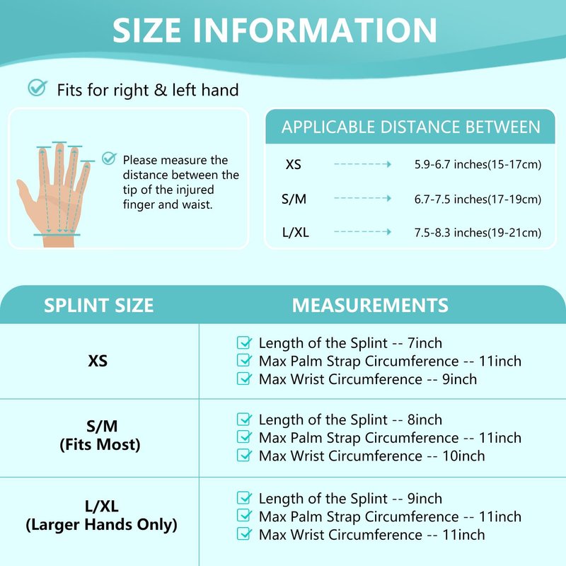 - 【SIZE GUIDE】 Please measure the distance between the tip of the injured finger and the wrist. XS: applicable distance between 5.9-6.7 inches(15-17cm); S/M:applicable distance between 6.7-7.5 inches(17-19cm); L/XL: applicable distance between 7.5-8.3 inches(19-21cm). The finger splint fits for men and women, either left hand or right hand.