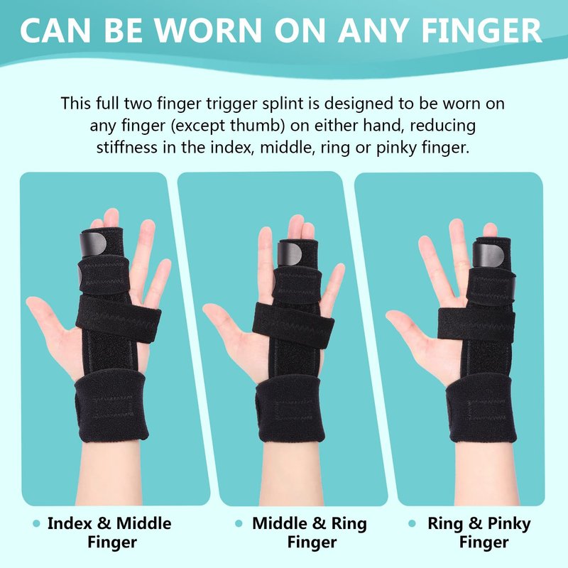 - 【2 FINGER SPLINT】This trigger finger splint is designed to be worn on any finger(except thumb) on either hand, reducing stiffness in the index, middle, ring or pinky finger. Except for the fixed fingers, other fingers can be bent freely, making your work and life unimpeded.