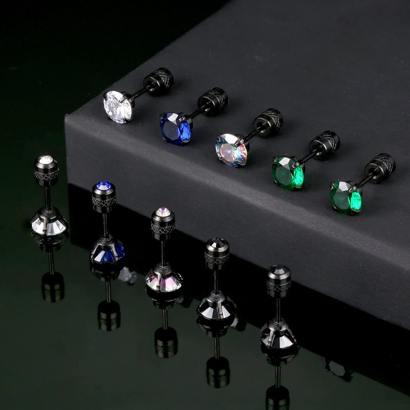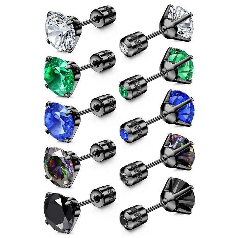 FIBO STEEL 5 Pairs Titanium Screw Back Surgical Stainless Steel Stud Earrings for Women Men,Rainbow 5A Cubic Zirconia Studs Double Side Earrings Piercing Sleeper Studs Jewelry 6mm Black Round
