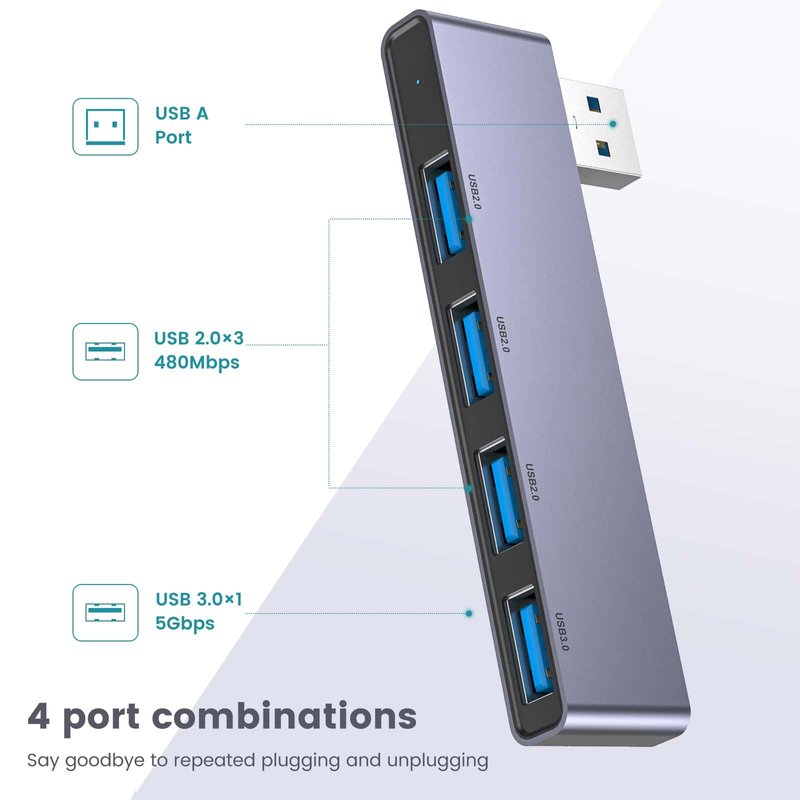 USB Hub Multiport Adapter contains 1*USB 3.0 and 3*USB 2.0,supports super faster data transfer up to