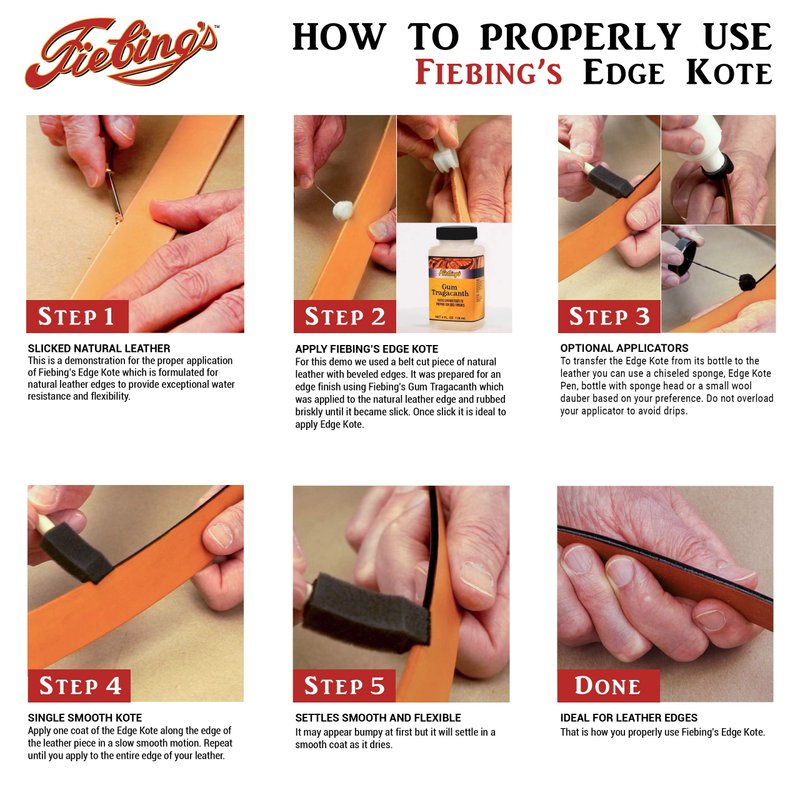 - CUSTOMIZABLE: Edge Kote can be thinned with water for customized application and coverage. Buff the leather edges after Fiebing's Edge Kote Leather Edge Paint dries for a blended and polished finish.