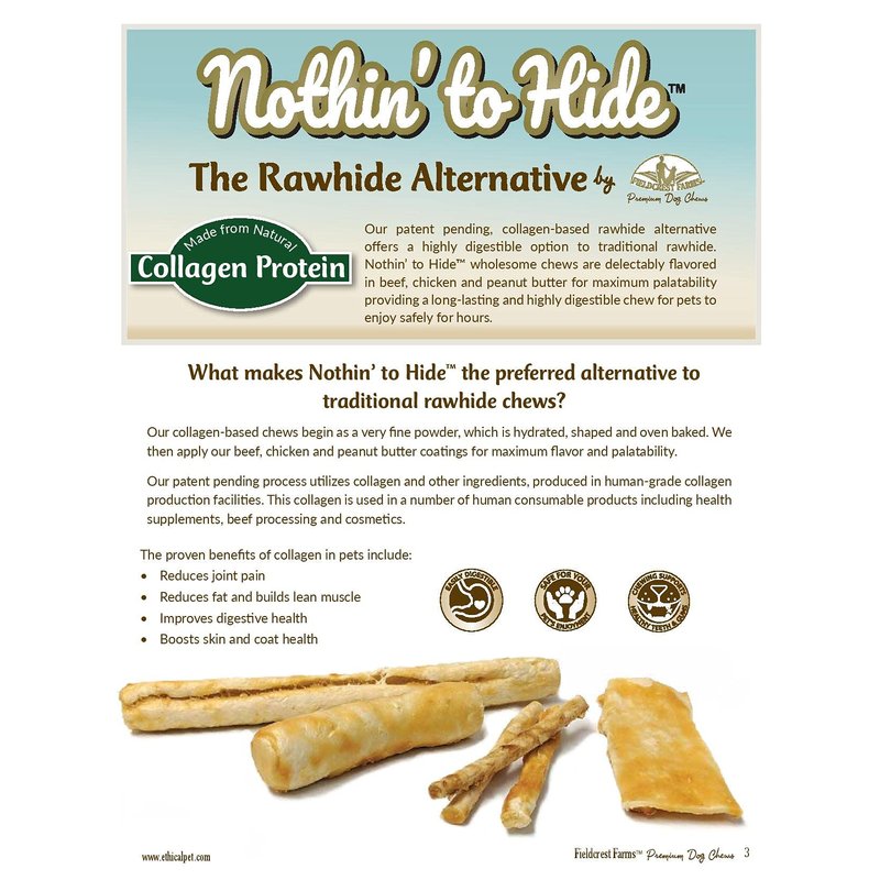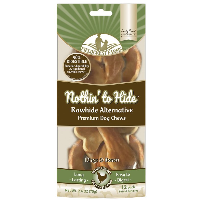 Nothin’ to Hide by Fieldcrest Farms is a healthful, highly digestible rawhide alternative. These wholesome natural dog chews are delectably flavored with delicious, wholesome chicken flavor for maximum palatability. They provide a long-lasting chew for dogs to enjoy safely for hours. Unique ring and bone shapes also provide mental stimulation while your dog chews.
