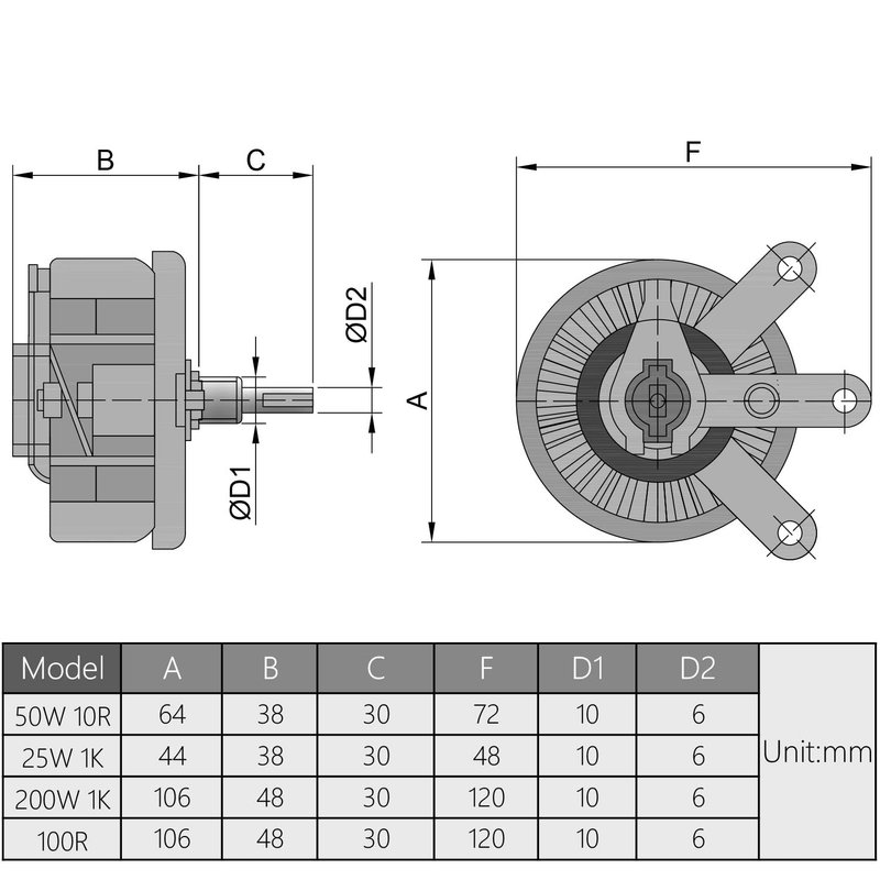 - [Parameters] - Model: Variable sliding potentiometer with knob; Resistance Value: 100R Ohm; Power: 200W; Knob Size: 30 x 19mm/ 1.18" x 0.75"(Max.DxH); Overall Size: 105 x 80mm/ 4.13" x 3.15" (DxH); Tolerance: +/-5%; Shape: Porcelain Plate