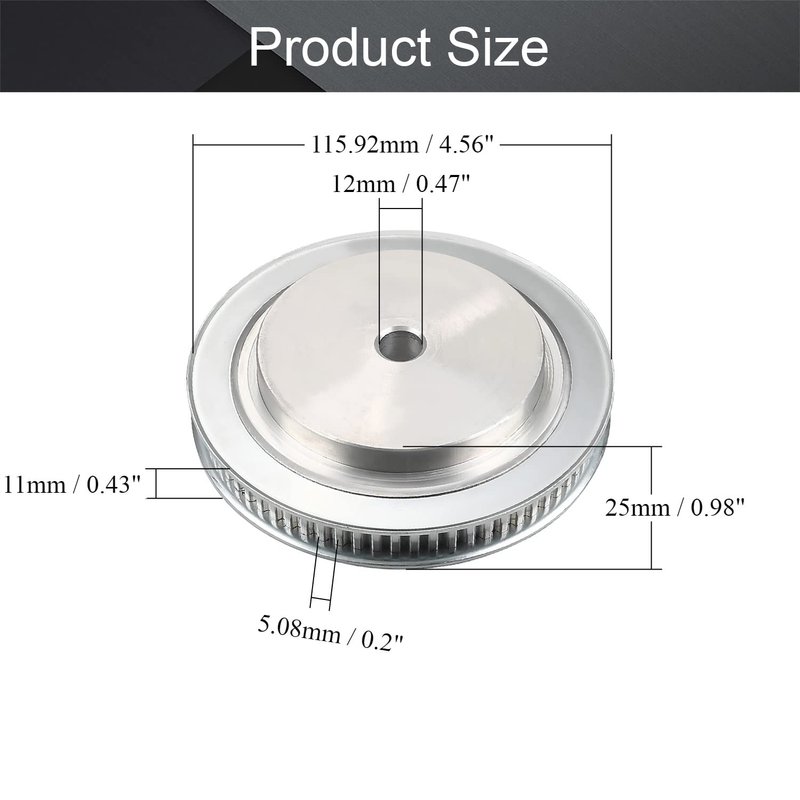 - 【Parameters】- Bore Diameter: 12mm/0.47"; Total Height: 25mm/0.98"; Tooth Outer Diameter: 115.92mm/4.52"; Tooth Width: 11mm/0.43"; Teeth: 72T; Tooth Pitch: 5.08mm/0.2".