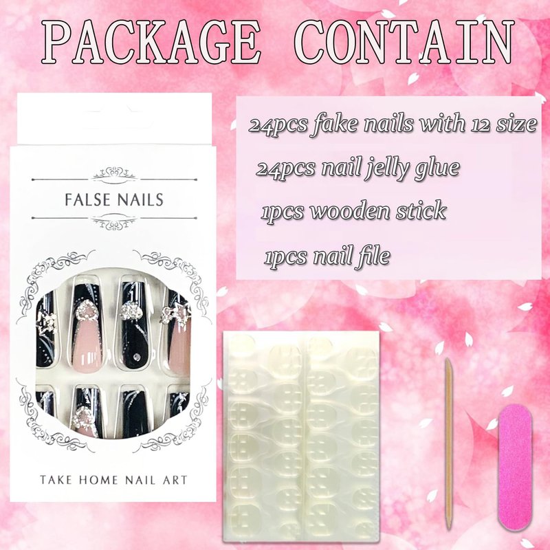 - 【False Nails Sets】You'll get 24 extra long coffin false nails in 12 sizes. 1 mini nail file, 1 small wooden stick, 1 piece of press on nails adhesive sticky tabs.