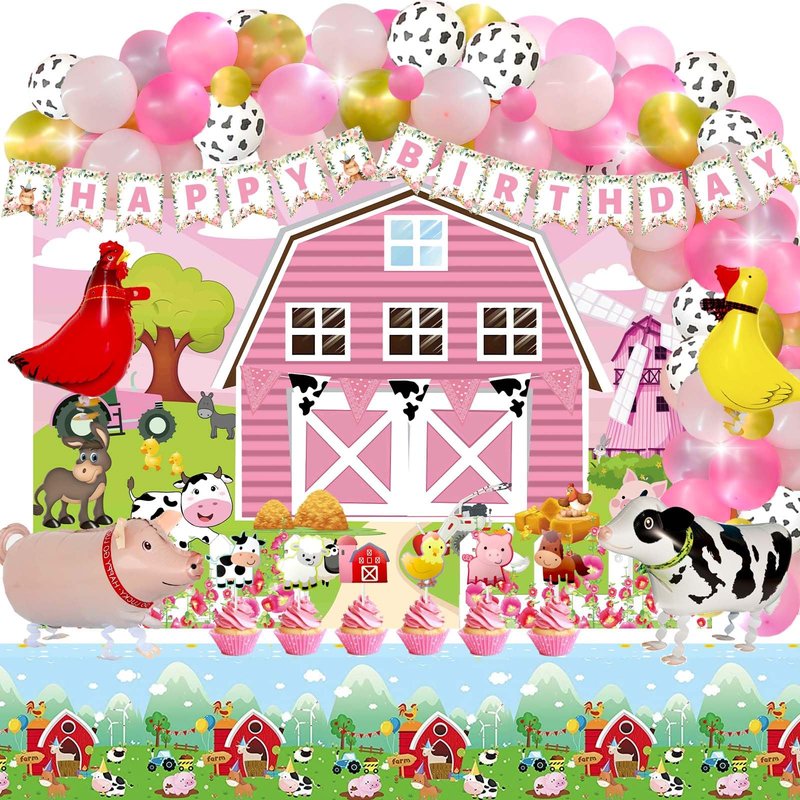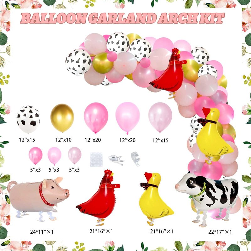 - FARM PARTY DECORATIONS INCLUDES - 55 x 12’’ pink latex balloons | 15 x 12’’ cow print latex balloons | 10 x 12’’ gold latex balloons | 9 x 5’’ pink latex balloons | 4 x walking animal foil balloon | 1 x backdrop | 1 x banner | 1 x tablecloth | 6 x cupcake topper | balloon strip | glue dots | ribbons