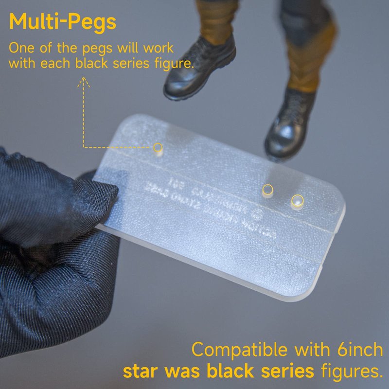 - MULTI-PEG BLACK SERIES ACTION FIGURE STANDS - Our new figure stands come with a multi peg(three pegs) option so that can fit different peg size of BLACK SERIES STAR WAS figures. We have tested them on pretty much every figure that has been released and with the exception of three then we are confident that at least one of the pegs will work with each figure.