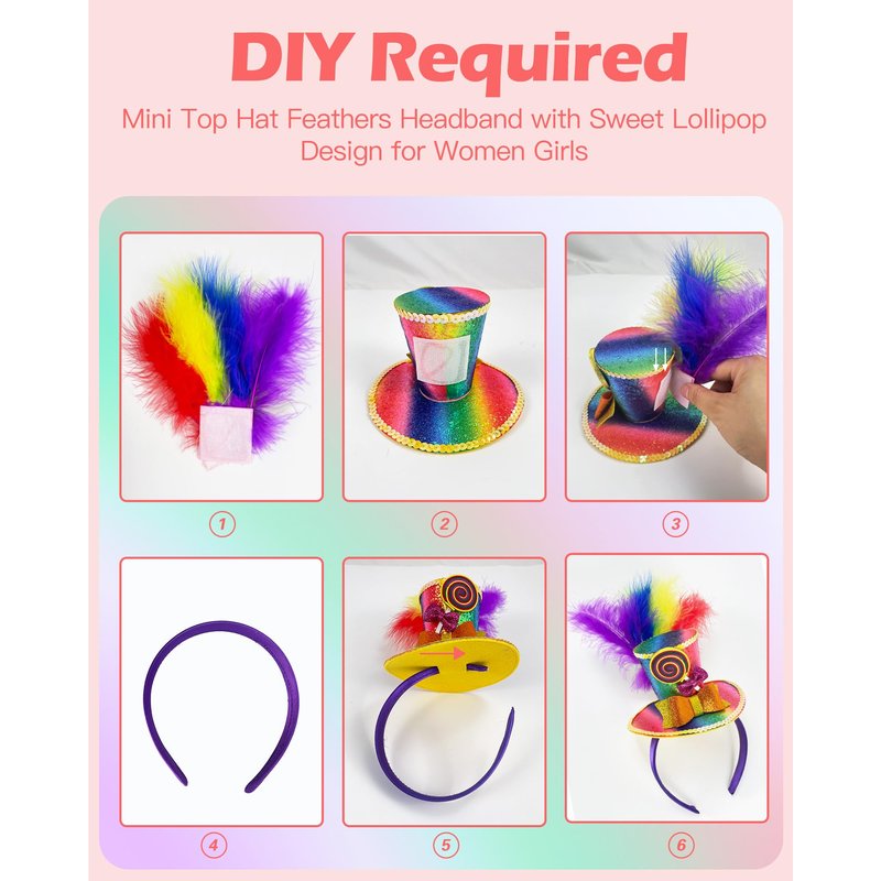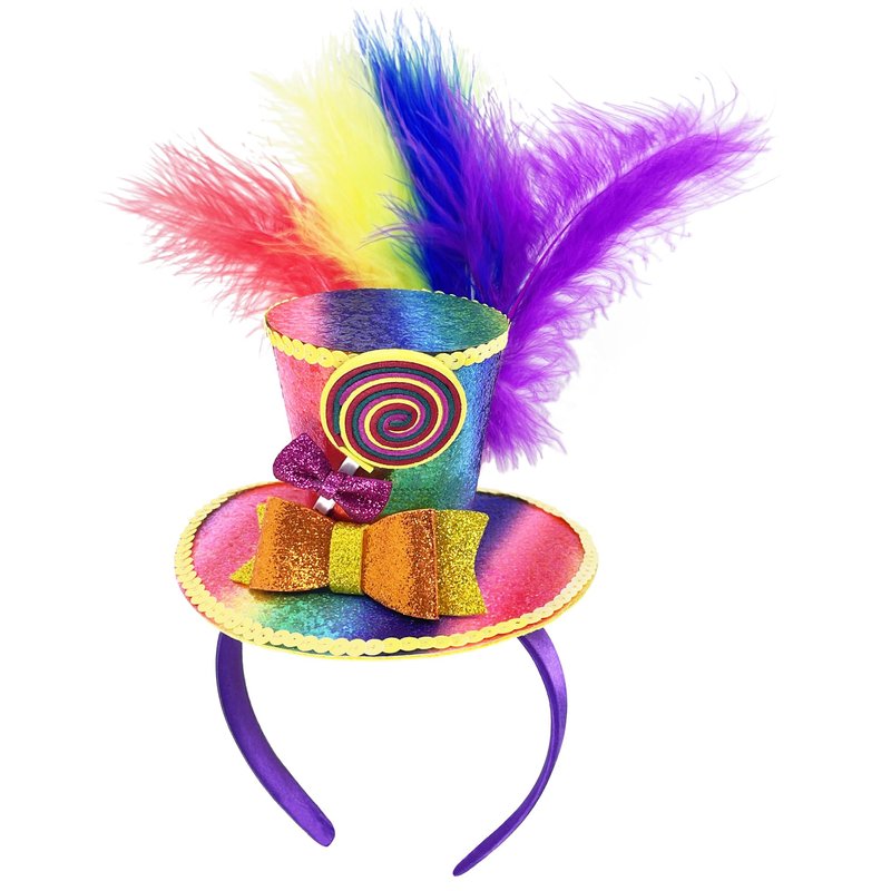 Fikinise Mini Top Hat Headband with Multicolor Feathers for Women Girls Rainbow Feather Headband Top Hat Feather Hair Accessory Rainbow Parade Cosplay Halloween Hat Party (Candy