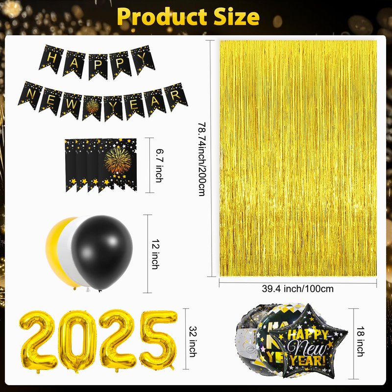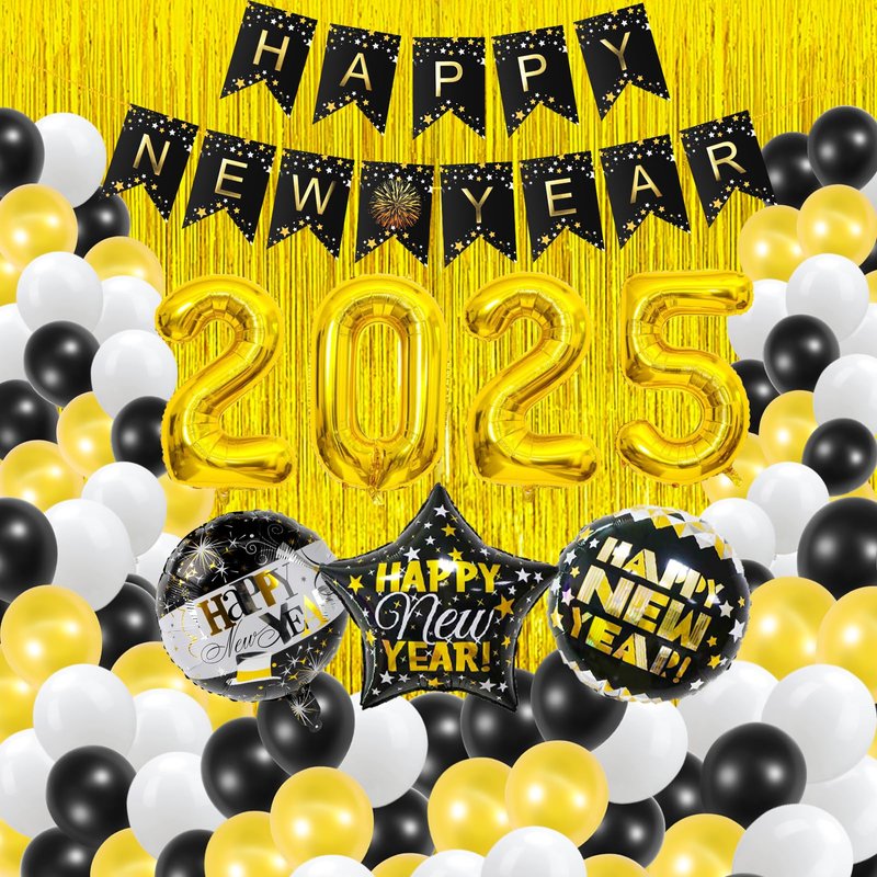 - 【New Years Eve Party Supplies 2025】This Fikowo New Years Eve Party Supplies 2025 contains all the decorations for the festival, it includes New Year banner, 60 12-inch balloons (20 gold, 20 white and 20 black), 1 2025 New Year foil balloon, 2 matte gold foil tassel curtains, 3 18-inch foil balloons, a 33-foot ribbon and a roll of dot glue. All the decorations to welcome the arrival of the New Year 2025 are packed in this package.
