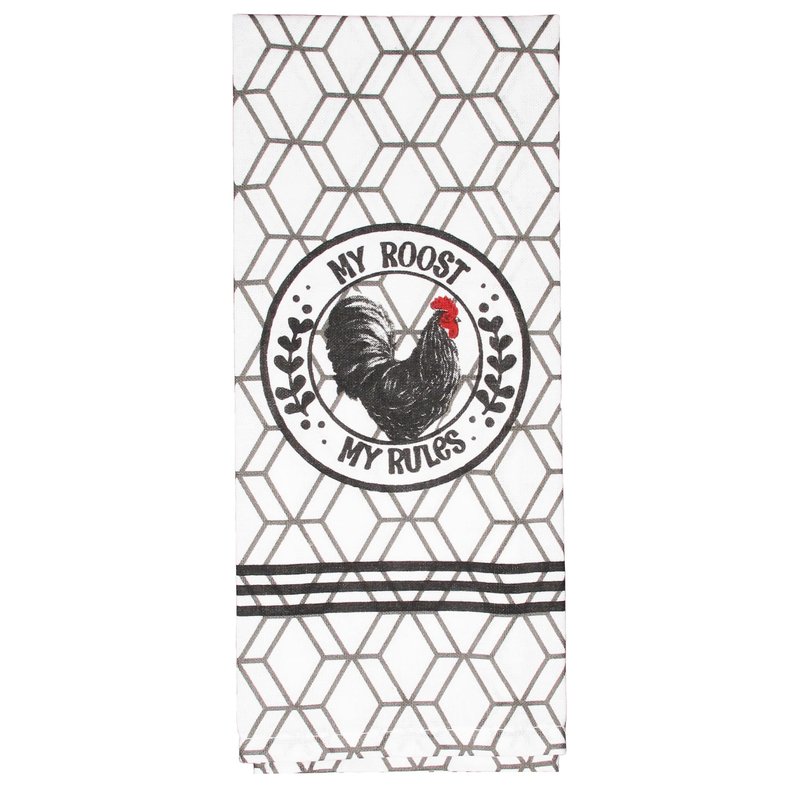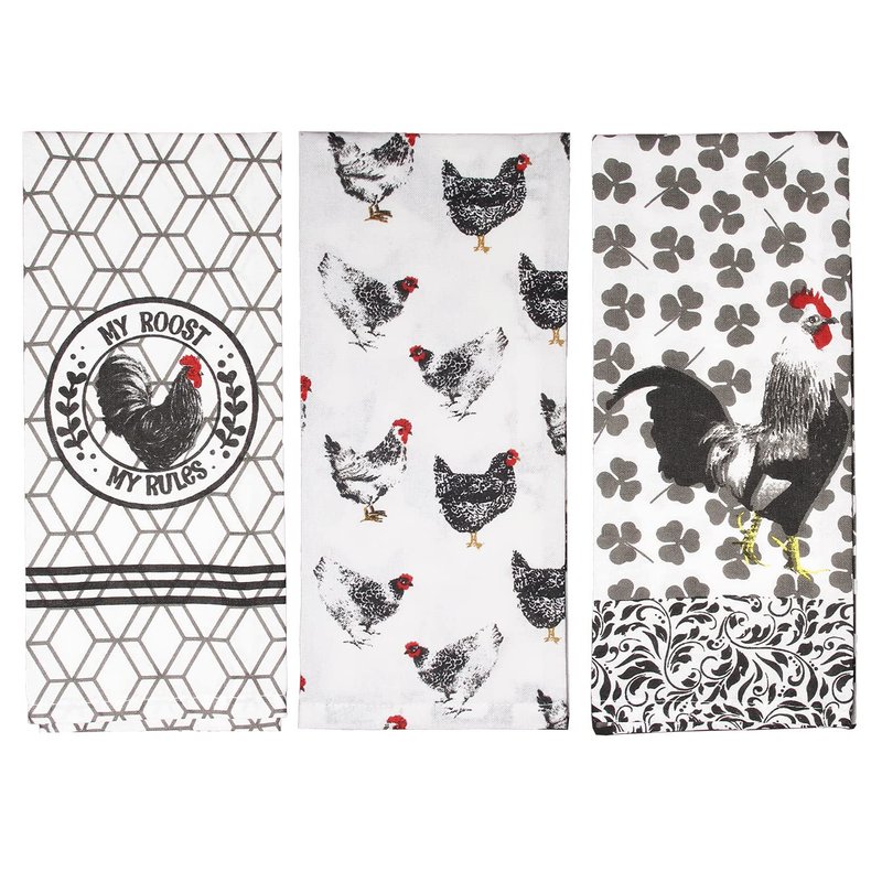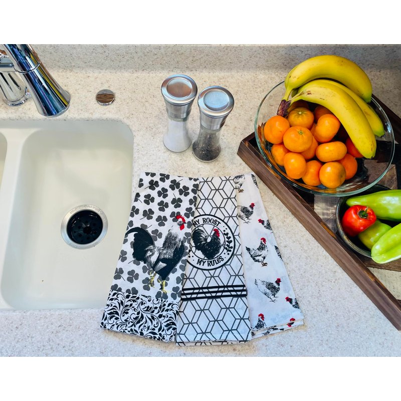 - ROOSTER THEMED KITCHEN TOWELS SET: Rooster dish towels set of 3 features Chicken Kitchen Towel, My Rules Farm Kitchen Towel and Clover Farmouse Kitchen Towel. Ideal for farmhouse kitchen décor on a farm, cabin, lodge, lakehouse, camper, or ranch. Rooster towels have a sewn in fabric loop for easy hanging and drying.