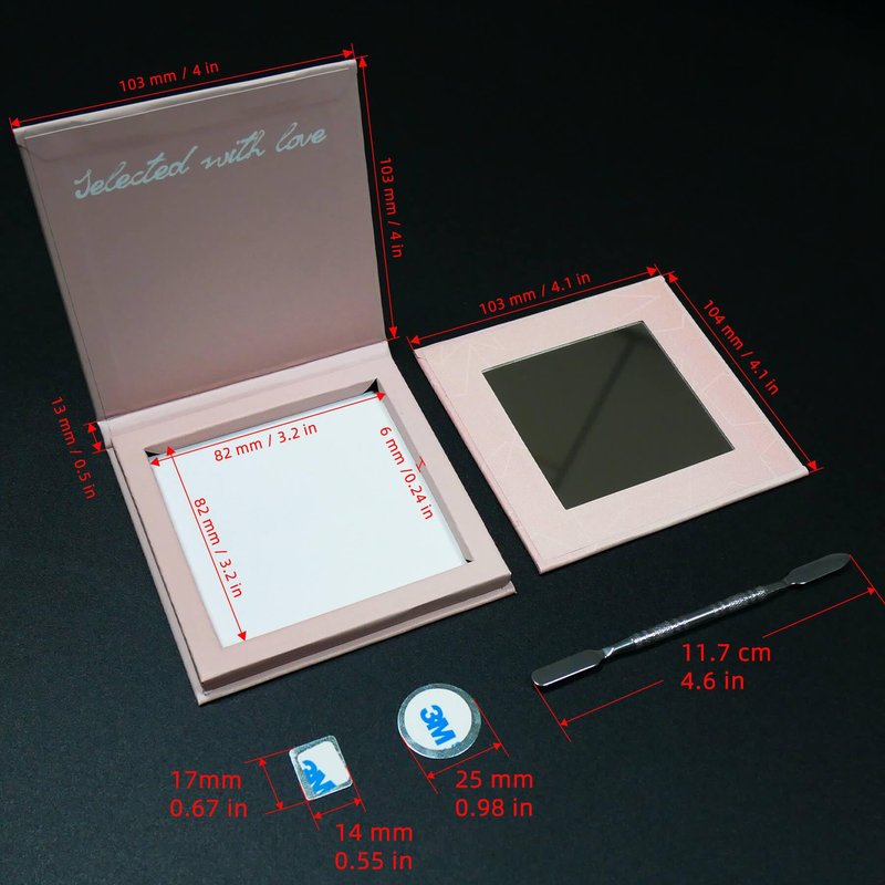 - Magnetic Palette Dimensions: External dimensions: 10.4x10.4x1.5 cm (4.1x4.1x0.6 in); internal dimensions: 8.2x8.2x0.7 cm (3.2x3.2x0.28 inches). Fits approximately 9 to 12 1-inch eyeshadow pans, depending on layout