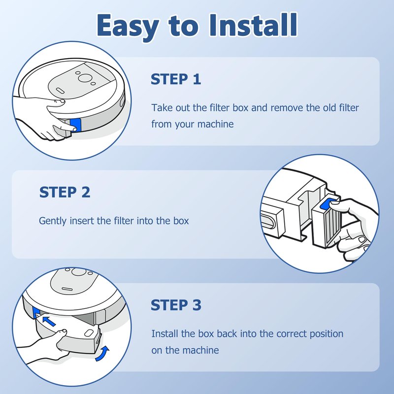 EASY TO USE: Our roomba filter replacements for iRobot Roomba e, i and j series vacuum cleaner i7 i7 Plus j7 E5 E7 are easy to install, no tools required, and it is recommended to replace this roomba accessories every 2-4 months to keep your vacuum cleaner performing at its best performance