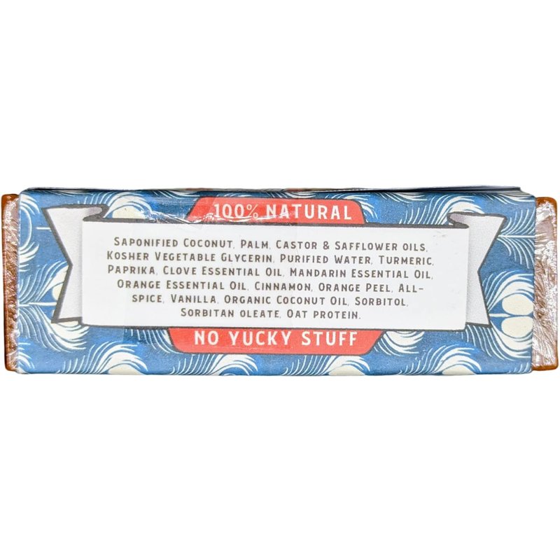 No Yucky Stuff! Our Soap recipes are 100% Natural and Vegan Friendly! Saponified Vegetable Oils (Coconut, Castor and Safflower) Kosher Veggie Glycerin. Highest quality essential oils herbs and spices. (Organic when available) Sorbital (natural thickener) Purified Water Sorbitan oleate (natural emulsifier) Absolutely no detergents, surfactants, sulfates, artificial scents, colorizers, or petroleum products of any kind. Our Labels are printed on 100% recycled paper. Sodium hydroxide (natural saponifier) 100% Natural Ingredients: Saponified Coconut, Palm, Castor & Safflower oils, Kosher Vegetable Glycerin, Purified Water, Turmeric, Paprika, Clove Essential Oil, Mandarin Essential Oil, Orange Essential Oil, Cinnamon, Orange Peel, Allspice, Vanilla, Organic Coconut Oil, Sorbitol, Sorbitan oleate, Oat protein.
