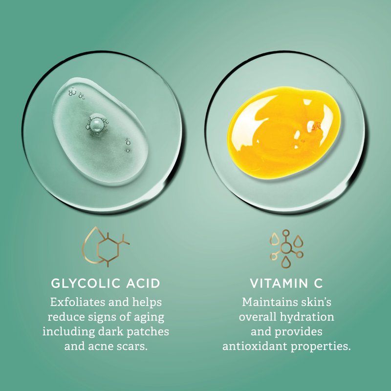 - GLYCOLIC ACID & VITAMIN C: Glycolic Acid exfoliates the skin and reduces signs of aging, including dark patches and acne scars, while Vitamin C maintains skin’s overall hydration and provides antioxidant properties.
