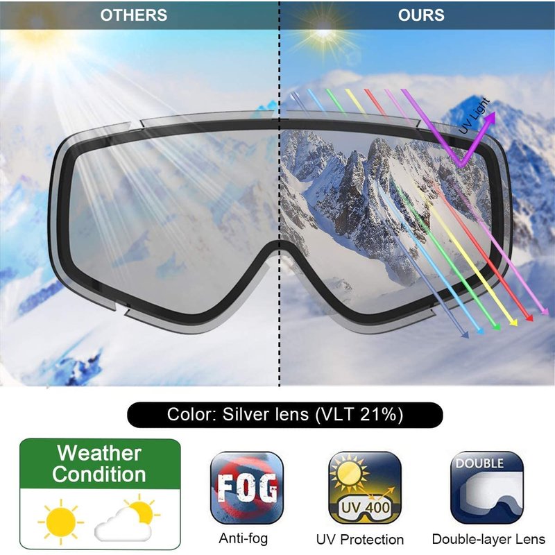 3. Injection-molded lens material provides 100% protection against UVA / UVB / UVC & harmful blue light up to 400nm, protect your eyes during the skiing.
