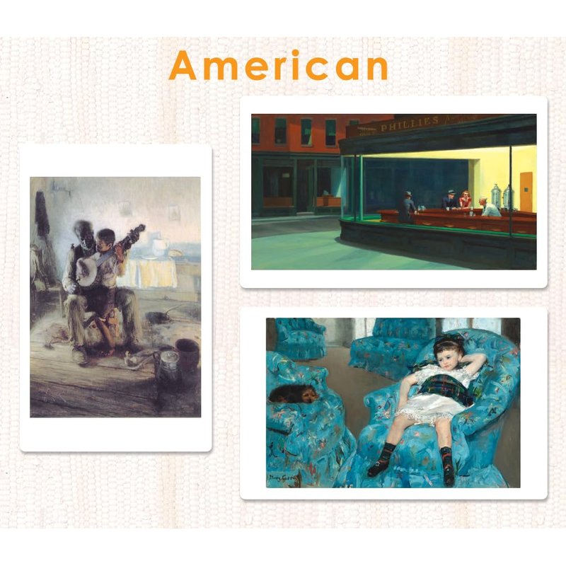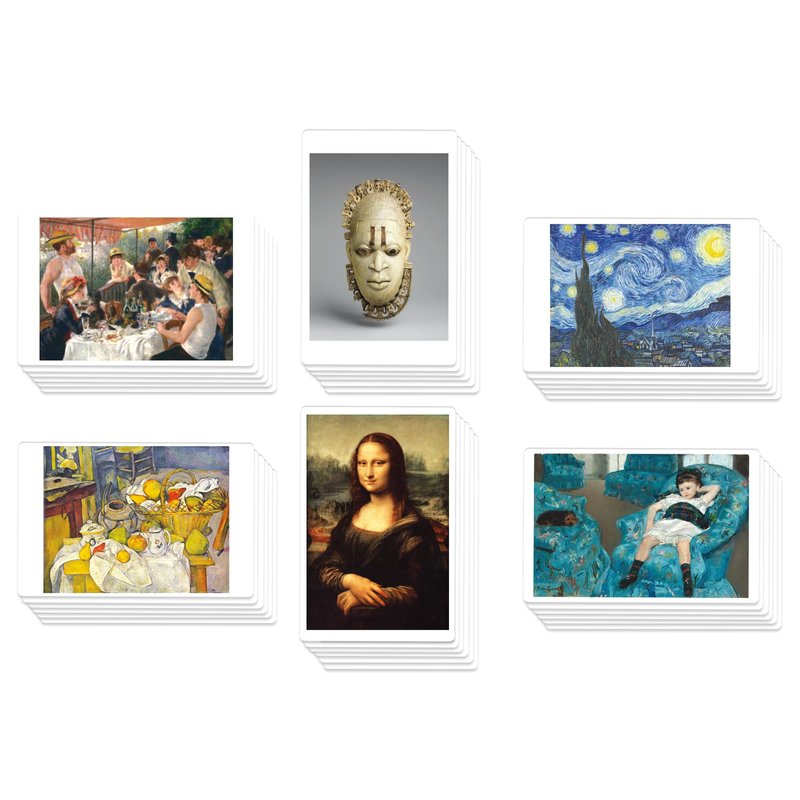 - Backs of the cards include key details including: name of the artwork; name of the artist; self-portrait, portrait, or photo of the artist; year(s) the art was created; year the artist's portrait was created; materials used (e.g., oil on canvas, fresco); and style represented (e.g., Impressionism)