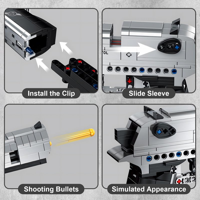 - 【Packed With Awesome Details】 Our building block gun set has 1:1 appearance, includes grip, trigger, muzzle, slider, clip and bullet. Equipped with launch props, the building kit can simulate the shooting action of real objects, bringing military charm and unlimited fun for you.